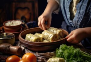 Place a portion of filling onto each cabbage leaf and roll tightly. Proper rolling prevents the filling from escaping during cooking and helps maintain structure.